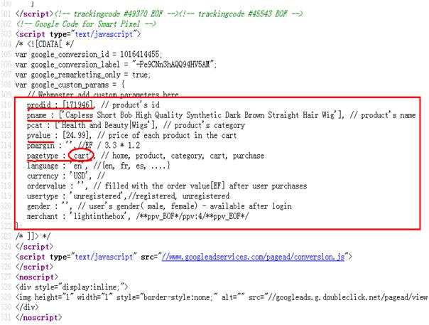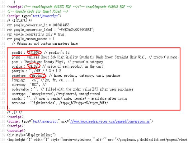 其他頁面就不一一列舉了,數(shù)據(jù)自定義參數(shù)越詳細,后面Adwords動態(tài)再營銷數(shù)據(jù)Cookies細分也越詳細,投放廣告的精度也越高,例如上面lightinthebox除了定義基本的prodid、ecomm_pagetype、ecomm_totalvalue三個參數(shù)之外,還自定義了pcat、pmargin、 language、currency、gender等等。
